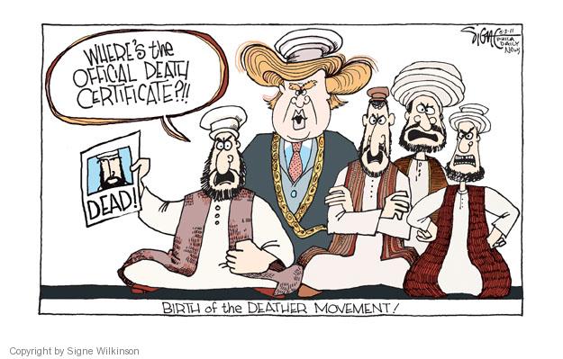 Honestly, Doreen, would you really believe a picture or film footage if you saw it? Methinks you'd find something wrong with it (similar to a Fox program I saw when Obama release his formal, full page birth certificate - here was the anchorman and a woman blowing it up and saying there was something wrong with the photocopy! )Doreen Peri wrote:How about a photo or film footage of them throwing his body in the sea?