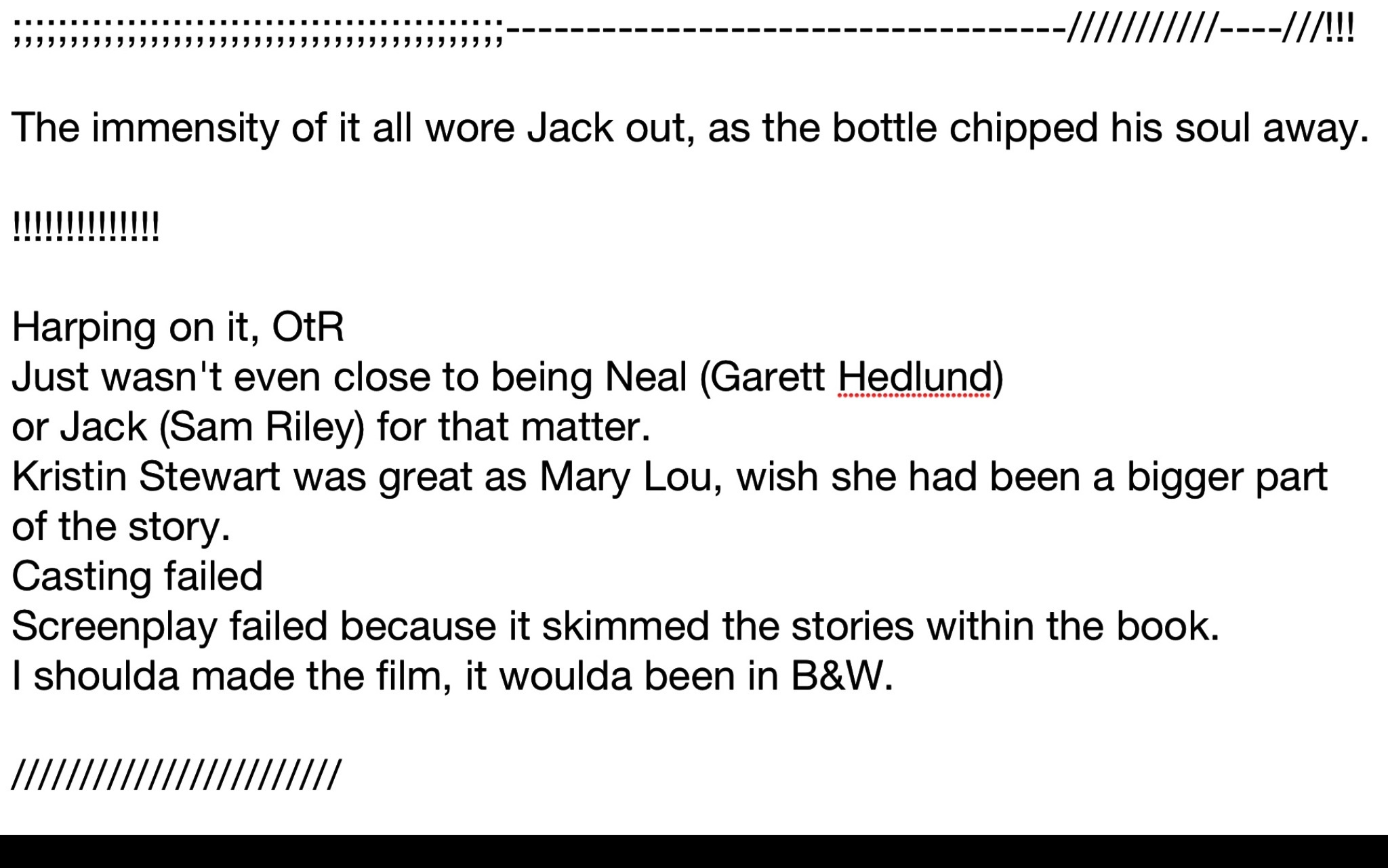 Hey Jack.......bottom line is I was sorely disappointed. Big letdown after waiting so long. Jack was bad casting....Neal was terribly cast, the guy being nothing like Neal. The screenplay adaptation was a skim of the original. The 3 mid 20's young women I watched it with thought it sucked....the visuals were excellent though. Levi thought it was alright. I'd say it should have been made 50 years ago.
