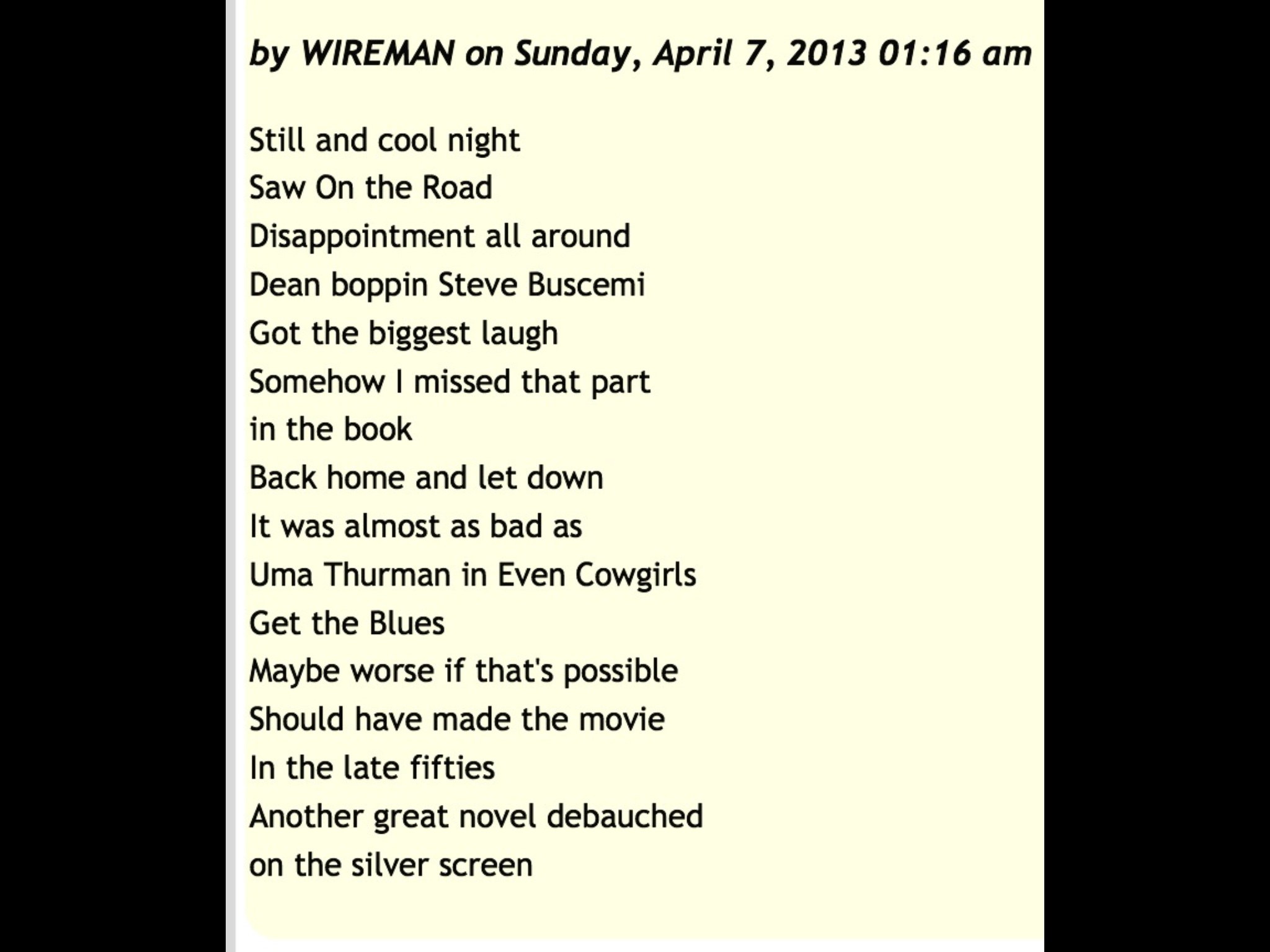 How could they screw it up, he wrote the freaking movie for them. I been trying to write that same movie for years with the road unwinding into the windshield.