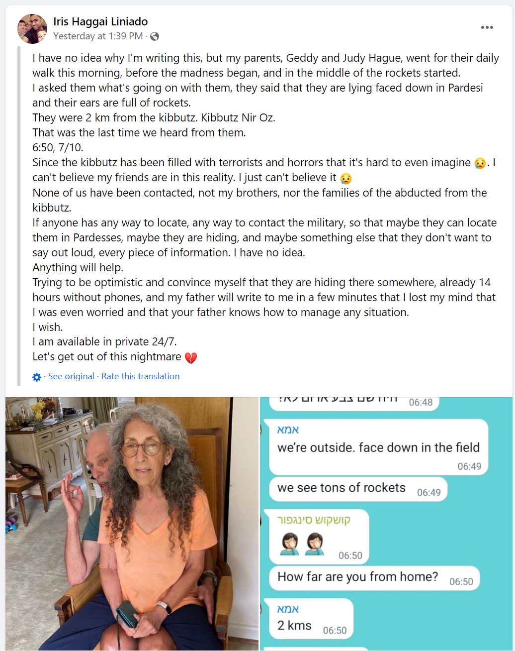 Prayers for Judih! Prayers for safety & PeaceUpdate (10/7, 19:30): My 2nd cousin once removed, Judih Weinstein Haggai and her husband are missing. They live on Kibbutz Nir Oz on the Gaza border that was infiltrated by terrorists and were out for a walk in the morning when the missiles started. The last we heard they were lying down while rockets flew over them. Hoping against hope for their safe return.