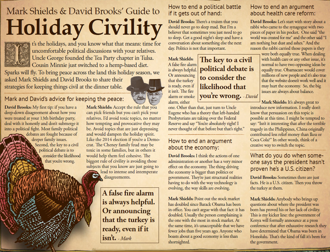 David Brooks: Let's start with story about a rabbi who came to the synagogue with two pieces of paper in his pocket. One said the world was created for me and the other said I am nothing but dust and ashes. And the reason the rabbi carried those papers is they were both equally true. So when dealing with health care or any other issue, it's normal to have two opposing ideas be equally true. In Obamacare, it would cover millions of new people and it's also true that the website doesn't work well and it may hurt the economy. So, the big issues are always about balance. ...