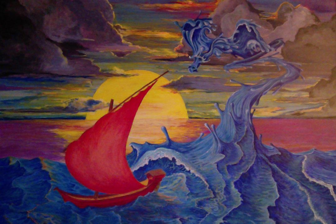 Trippy. Dig the wild red sail slicing the giant sun...