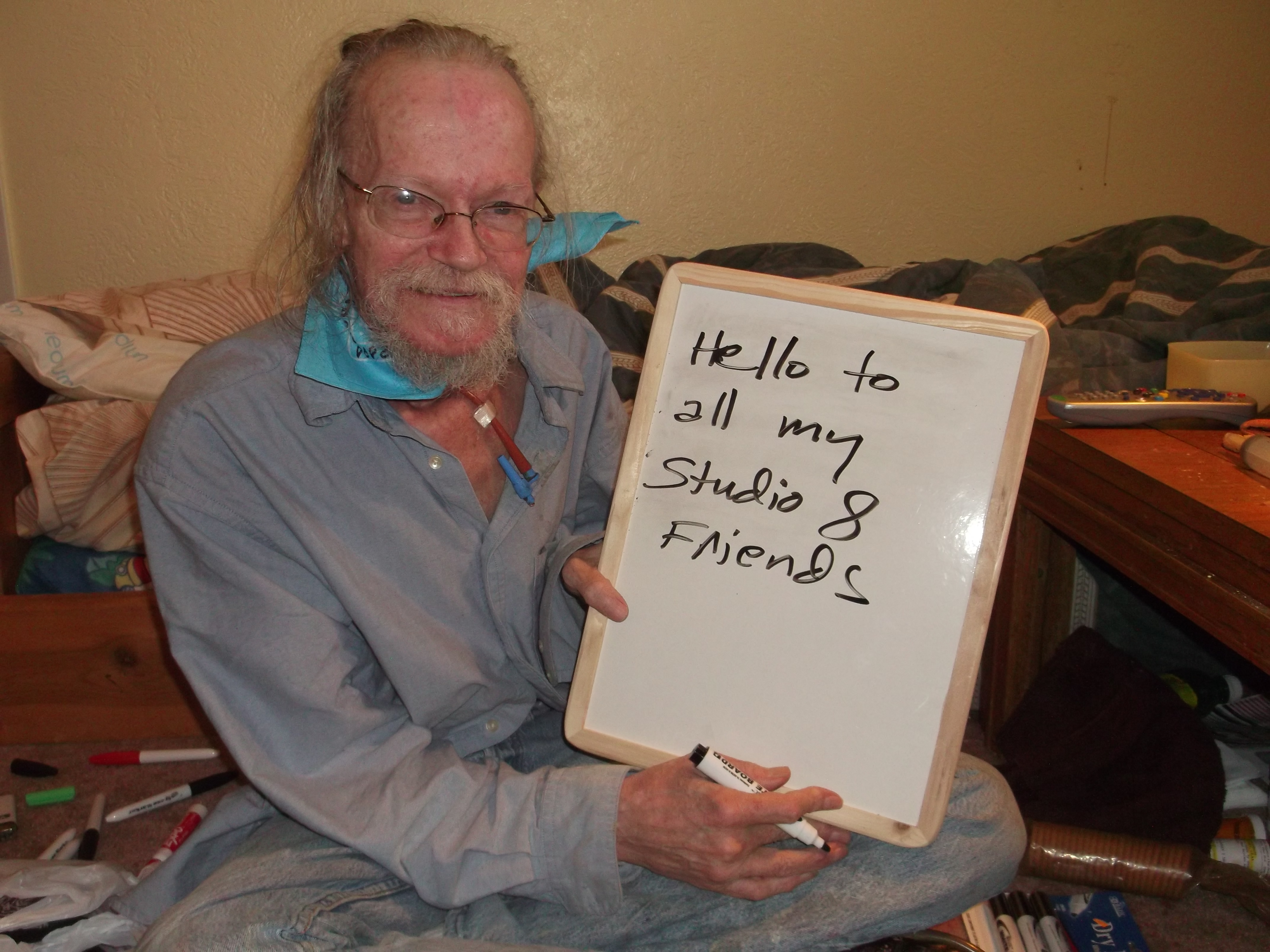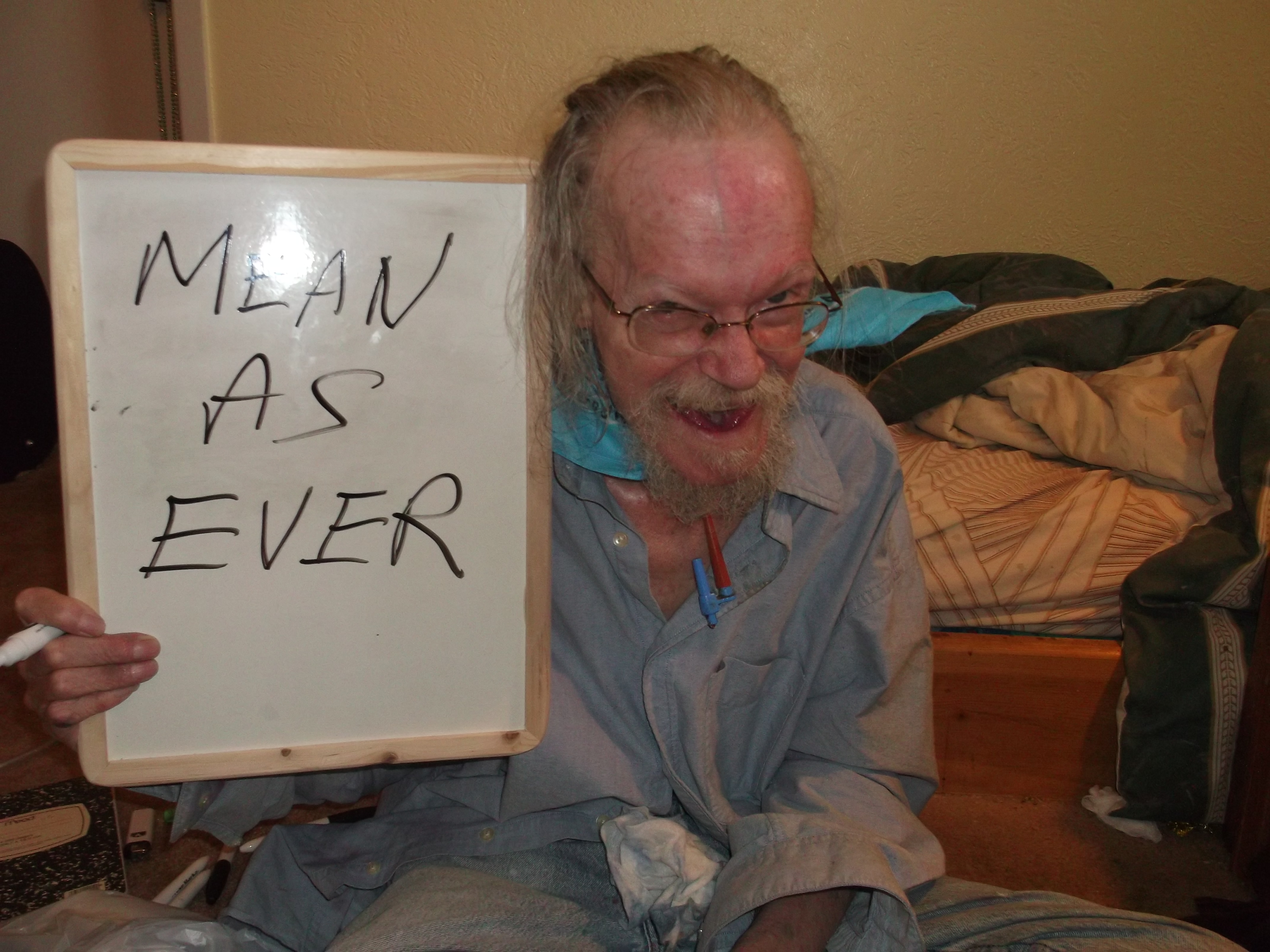 I'm here in a hotel room with Lightning Rod. He's writing on his erasable board since he can't speak. Here's what he wants to tell you all: