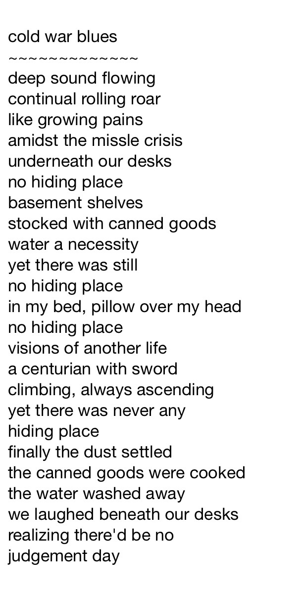 I remember hearing someone say during one of those drills....tuck into a ball so you can kiss your ass goodbye.....do you think they were being insincere about that method of protection.....hiding from radioactivity.....or was this once again, and again and again more of the fear mongering that prevails today...keep folks afraid, and you've got them by the short hairs....honestly even at a young age, I thought it was stupid....I knew my desk couldn't keep me safe....right about that same time I started to question the nuns at St. Dominic School asking them, Won't God Keep Me Safe ?