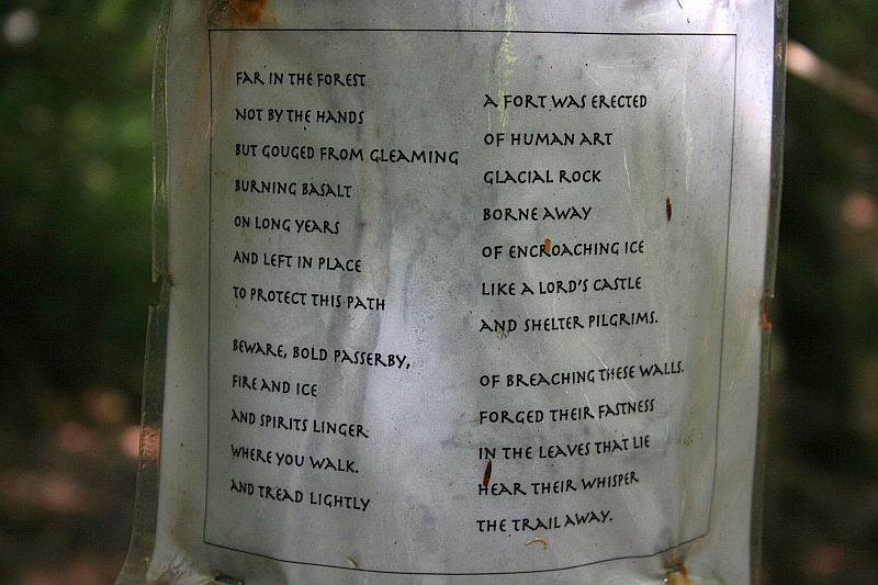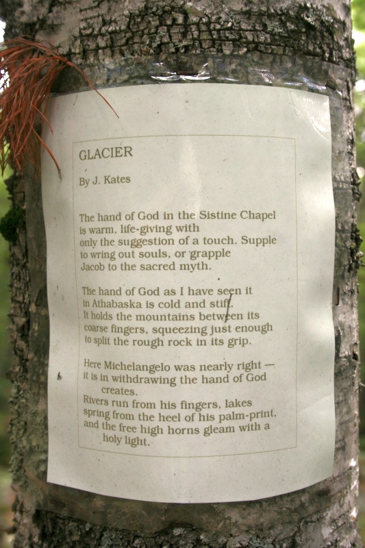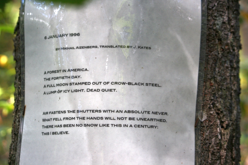 A writer & translator of poetry (Russian in particular) lives a few miles from me, much closer if you bushwhack through the woods. There's a little side trail off the RR grade I take the dog most afternoons, which I explored solo one bitterly cold winter day a few years back. I discovered that he had not only blazed the trails, but had laminated gems of poetry and nailed them to random trees. It was like an Easter egg hunt. One in particular so caught my fancy that I pulled off my gloves and laboriously copied it down by hand: