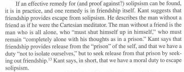 ibidIf an effective remedy for (and proof against?) solipsism can be found, it is in practice, and one remedy is in friendship itself. Kant suggests that friendship provides escape from solipsism. He describes the man without a friend as if he were the Cartesian metlitator. The man without a friend is the man who is all alone, who “must shut himself up in himself," who must remain “completely alone with his thoughts as in a prison.” Kant says that friendship provides release from the “prison” of the self, and that we have aduty “not to isolate ourselves," but to seek release from that prison by seek-ing out friendship.13 Kant says, in short, that we have a moral duty to escape solipsis