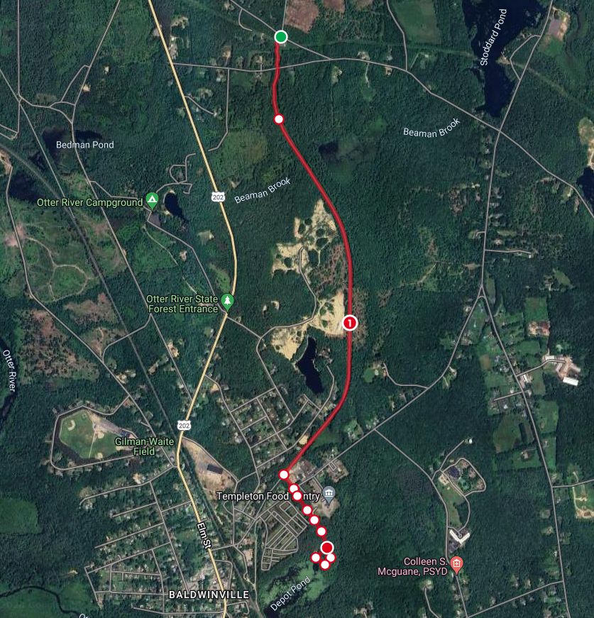 The string of white circles near the bottom is where I detoured around the rail bed because it had become impassable. It took me past the Templeton Public Works building, across Bridge St., and into the woods along an ATV path running alongside a cemetery. (Baldwinville is an unincorporated village within the town of Templeton MA.) The sun was getting a little low in the sky by then, so I abandoned my attempt to find where the rail=trail resumes, & just doubled back.