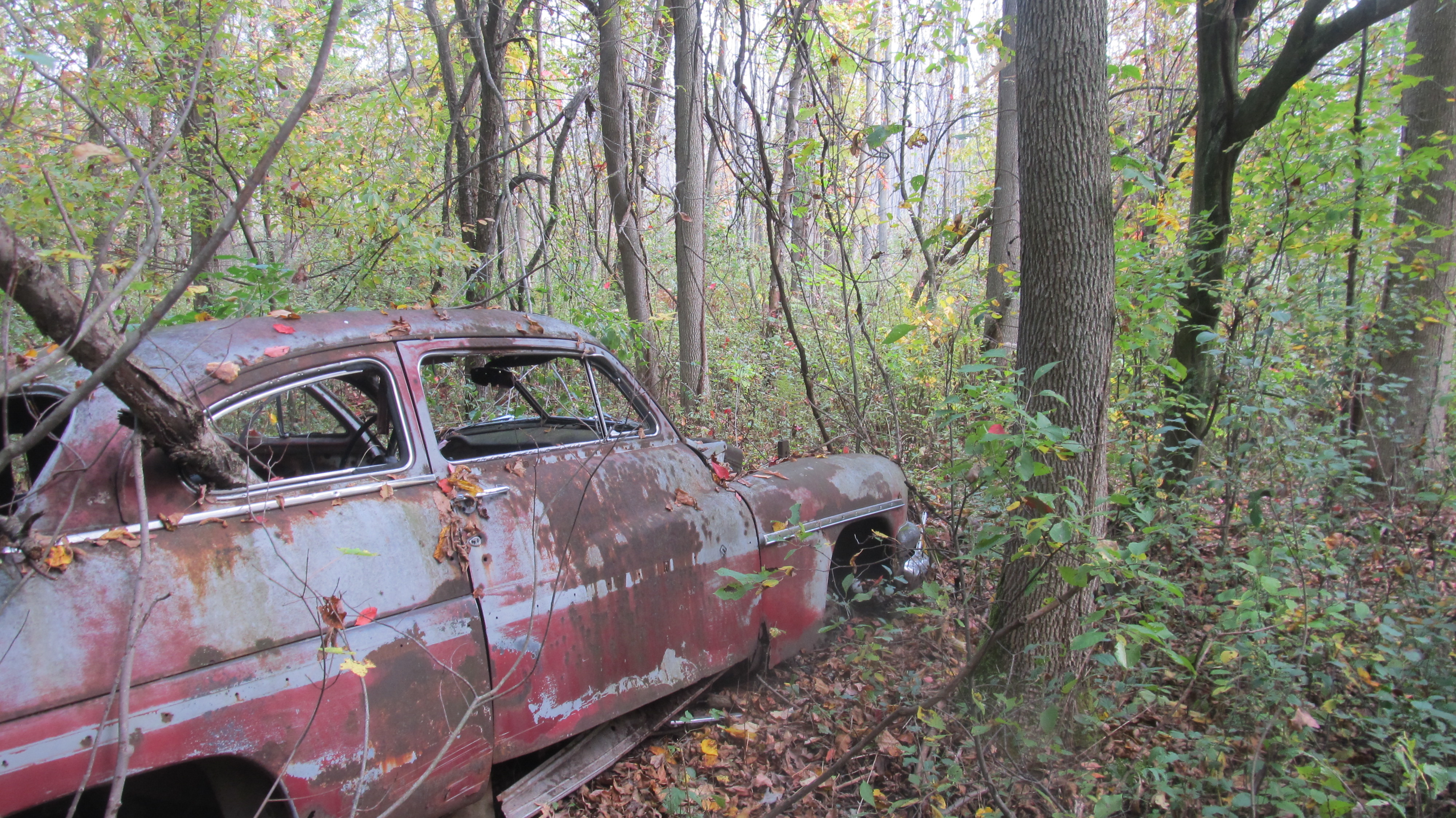I love shipwrecks - like junk cars too - used to be open junkyards around here when i was a kid - they were always evocative to me - and I'd watch them thru the turn of the seasons - winter covered with snow - spring, all the mud & slop - summer with the tall grass the cars almost losing themselves in it - autumn with the leaves decorating the rusty bodies - most of them are gone now due to laws from three different levels of gov't - but some exist yet though you can't see them behind their tall fences - I like finding abandoned cars out in the woods - rare these days but I know where some are at because I have more than a passing acquaintance with the woodlands & forests around here - i know where one is fairly close to the lodge here - been where it's at so long it is sinking into the earth like a shipwreck - a rare one too for these days - a '49 or '50 Merc with the split two piece windshield - when i first came upon it i named it the General George Armstrong Custer car - it's in that rare moment where you can still know it's a car but the disintegration is well along so that it is turning into something else - when the deer hunting for Jesus boys have finished the season & are gone from the woods I will get a pic of it for ya - won't be 'til after Xmas though - wait, I may have some older pics of it on file - hold on ... yeah do have one - taken autumn of 2012 i believe - i came over this ridge and there it was at the bottom - i think it was dragged or driven to the top of the ridge & then given a push - it lies between the bottom of the ridge and the edge of the marshland beyond - the deterioration has been rapid this past year though and it don't quite look like this anymore - i'll get a more recent photo when the deer hunters clear out at the end of december - thx for the shipwreck shot