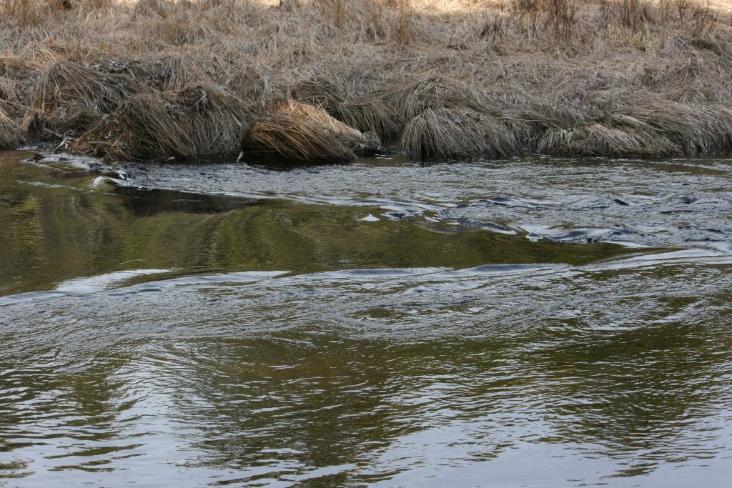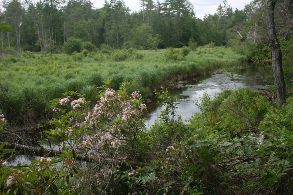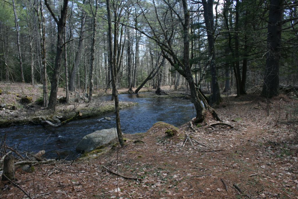 In the vicinity of the gauging station, the surroundings are quite open & accessible, but before long the brush presses in as the land levels off, and the brook slows as it broadens into a leisurely meander through the floodplain.