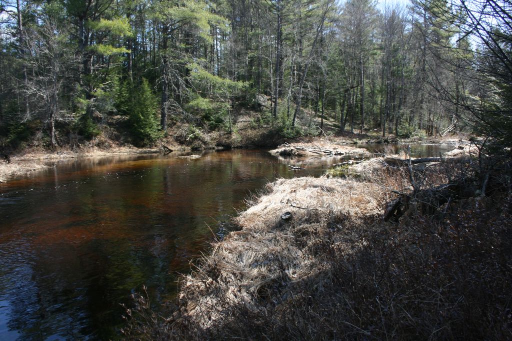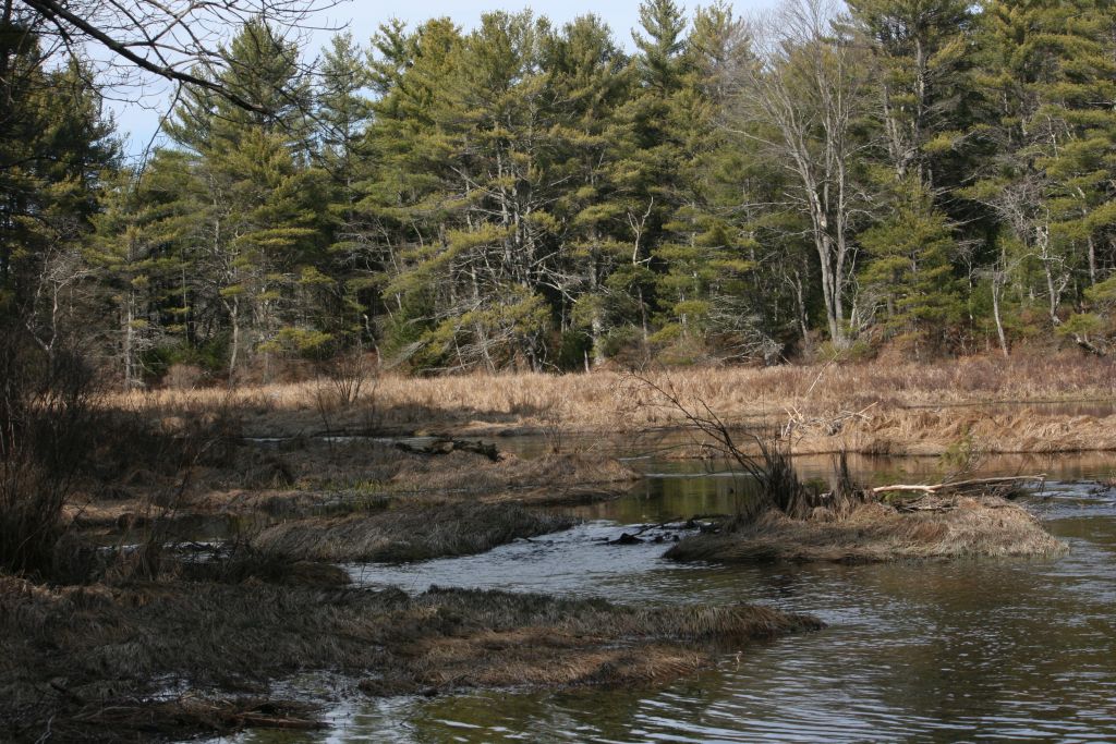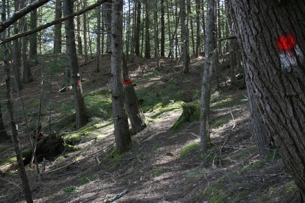 I'd assumed that the trail originated from a campground situated beside the confluence - but it doesn't - it can't. The site lies west of the watercourse, and without a bridge there's no direct access for an ATV. I came within sight of a few RVs and a beach, but never closer than the slowly gliding waters of Priest Brook would allow. Here the trail seems to veer off to the east - heading upslope into mixed hardwood, to... where? The map shows only a large undeveloped tract.