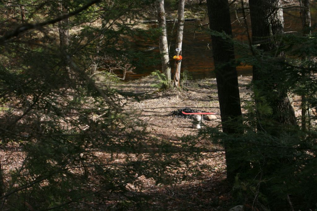 Where it's prone to springtime flooding, the trail veers off slightly upslope into the woods. At the edge of one of these stretches, I came upon a clearing beside the brook. It looked like an impromptu campsite: a well-worn track to the water, a firepit filled with charred branches.... a pair of cross-country skis propped upon a log, its poles strapped to a tree nearer the water.