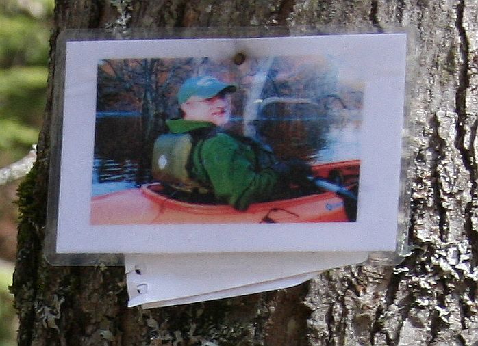 The plot was open and had clearly seen a lot of foot traffic, but was remarkably free of trash. I paused to regard the skis, then continued to the tree. A laminated photograph was pinned to the trunk just above the floral arrangement, depicting a man maybe in his 50s seated in a kayak, holding the paddles feathered across his lap. He smiled back at the camera over his shoulder. I unpinned the photo and turned it over. On the back was a simple handwritten farewell to "Bernie". I assumed Bernie was the kayaker, the message from friends & family, and that they'd chosen this spot to erect a little memorial. The skis were probably his, too.