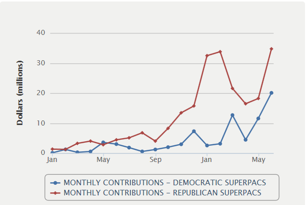 Republican super PACs have brought in $228 million since January 2011 while Democratic super PACs have collected $80 million in that time. The Fix is no math major but that’s roughly a three to one advantage for conservatives.