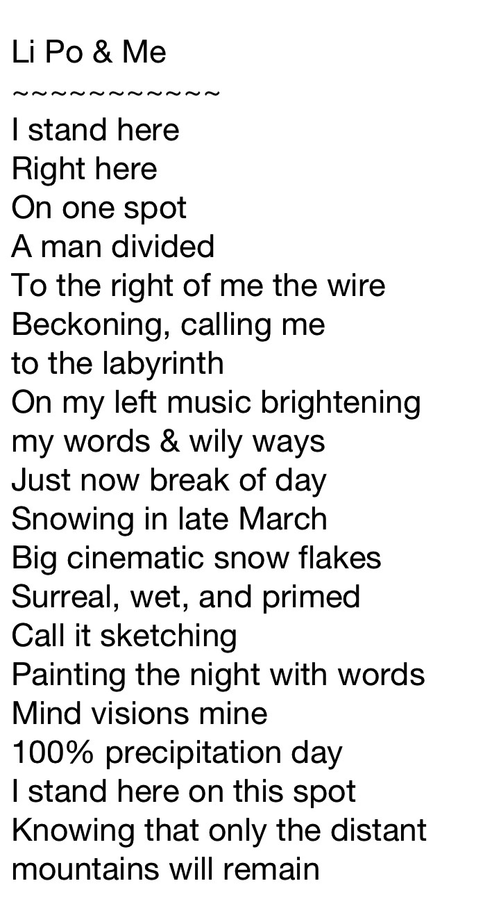 Li Po.... Han Shan..... Ryokan.......the simplicity of the East is a tremendous influence on wired me.....here,s another Li Po inspired poem....