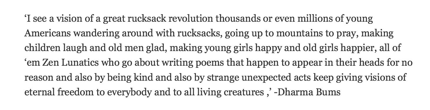 "I want to be a Zen Warrior like Japhy Ryder, for truth justice and the Buddhist way, make a wildnerness from an empire too." by Unk.