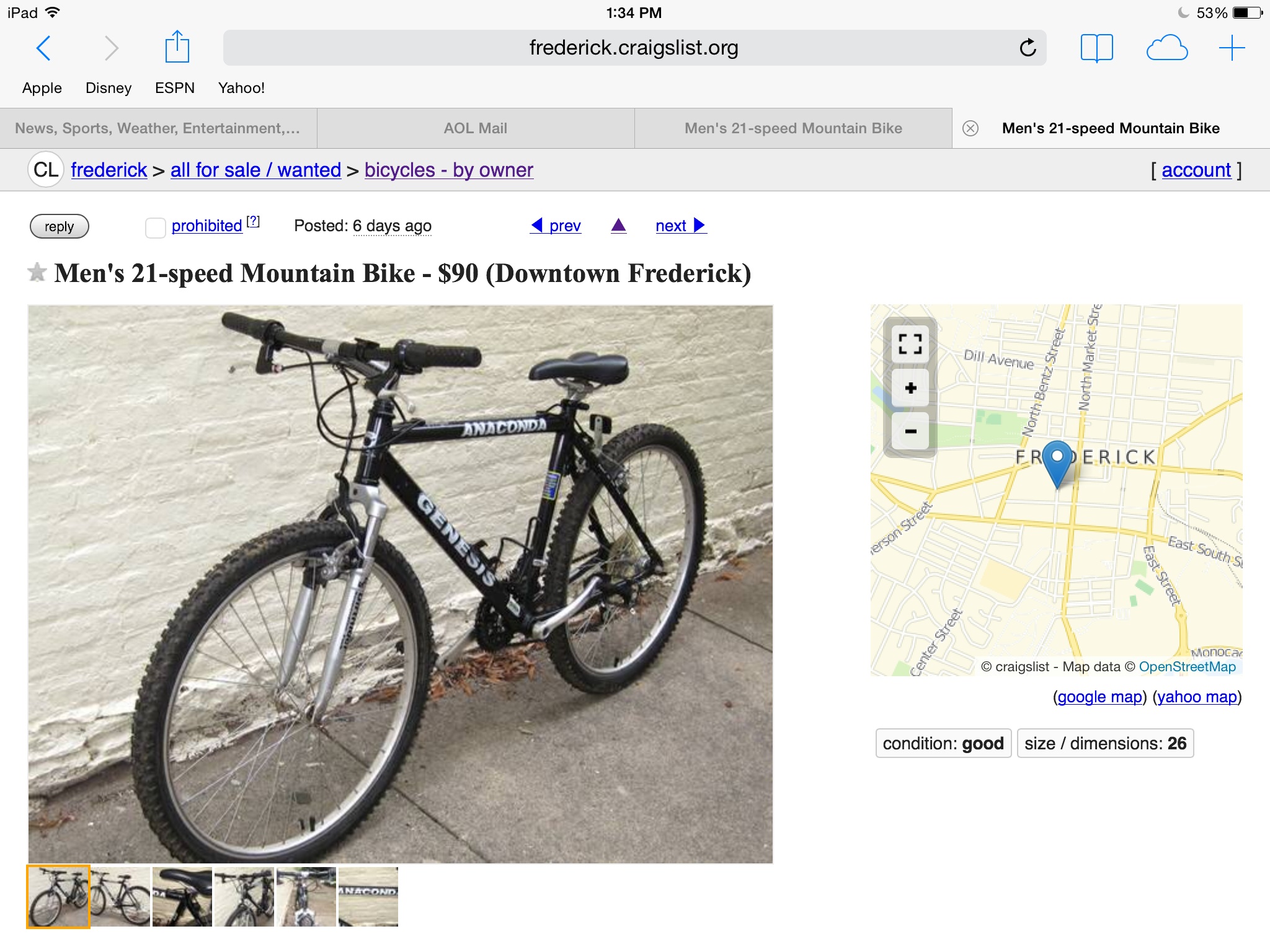 Hell Yeah Mongolia! I went to Frederick craigslist to see what I could see on this - this bike is a lot like the Coyote i bought last year - only diff is this one has a shock front fork - one on mine is solid - without being able to lay my own eyes on it I'd say might just be the bike for ya - these are called hybrids - the gearing is lower through all three ranges than an out-&-out road bike - these are real sweet and easy to get around on - no matter what ya face you got a gear for it, believe it - hell, Mark, if it shifts thru all it's gears smooth up & down, the rims true without much wobble & the brakes solid I'd say go for it - the asking price is in the ballpark - good kind of bike to begin with - even after buying the Tripel this year i ain't let go of the Coyote and maybe never will because i still love bombing around on it - the tires on this bike are a bit aggressive for street riding but that's no mind - you can swap them out for a more street friendly tire as you please -